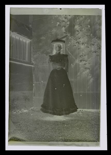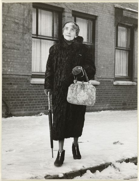Curator: What strikes you first about this street portrait? It's an early photographic print, sometime around the 1930s. Editor: Well, immediately the facelessness. That perfectly round orb where a face should be is startling. It lends a surreal, unsettling quality. It violates every convention of portraiture, doesn’t it? Curator: Precisely! And while attributed to an anonymous photographer, its defiance is what gives it a voice, especially given the context. During the Depression, individual identity often felt crushed by social forces. So this visual obscuring raises a fascinating set of questions. Editor: It certainly does. Orbs, of course, often symbolize totality, wholeness, even spiritual enlightenment. Here, it’s almost aggressively devoid of those positive connotations. It seems to express alienation. The background reinforces that, barren trees and an empty road. Is the anonymous tag also pointing to that concept? Curator: It could be! Street photography in the interwar era often became a potent form of social commentary, highlighting marginalized people and situations ignored in mainstream visual culture. Editor: I think the power here resides in that duality—the faceless form simultaneously critiques and transcends that societal context. She becomes every woman, yet paradoxically, no one in particular. Curator: An incisive point! In this respect, this work challenges established norms of both representation and identification within photography, turning an aesthetic absence into a commentary. Editor: A chilling and brilliant play with symbolism that invites a deeper reflection beyond surface appearances. This era of realism always comes with a punch. Curator: Indeed. We hope our brief exploration has helped illuminate a bit of the historical background and cultural implications of the image. Editor: It has, the photograph's eerie ambiguity sparks an enduring discussion. What a stark way to get its point across!