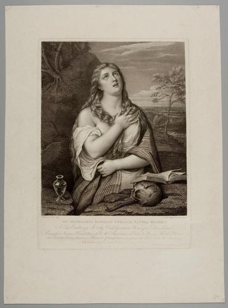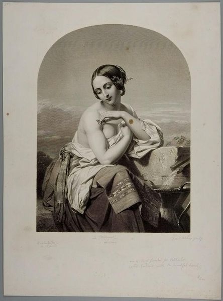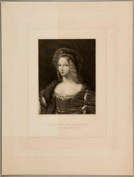 Editor: This is "Raphaelis amicitia celeberrima" by Jacopo Bernardi. The woman's gaze feels really direct. What do you see in this piece, especially concerning its historical context? Curator: I see a portrait that, while seemingly straightforward, invites us to consider the power dynamics inherent in representation. Who was this woman? What choices did she have in shaping her image? Bernardi, working in the 19th century, reproduces an earlier image, layering another level of interpretation. Consider the role of reproduction itself in shaping cultural narratives. Editor: So it's not just about the individual, but about the layers of meaning that have built up over time? Curator: Precisely. It's about interrogating the narratives we inherit and questioning whose stories get told and how. Editor: That makes me think about the lack of information about the woman represented; it’s powerful to question the silence. Curator: Indeed. Art becomes a space for critical engagement, challenging us to look beyond the surface.