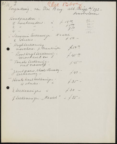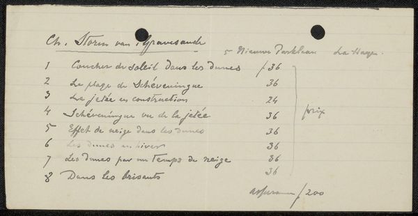 Editor: Here we have "Brief aan jonkheer Hendrik Teding van Berkhout," a letter to Esquire Hendrik Teding van Berkhout, from 1931-32, by Pieter Willem van Baarsel. It looks like ink on paper. It strikes me as almost an intimate glimpse into the mundane details of the artist’s life. What do you see in this piece, that perhaps I am missing? Curator: Oh, it's more than mundane! Look closer. This isn’t just a shopping list; it’s a little symphony of script! Each item, each flourish of the pen – it's like the artist is composing a visual poem out of the everyday. What feelings are evoked by the handwriting itself? Is it hurried, careful, confident? Editor: I see what you mean, there's a certain rhythm in the spacing and how the lists are broken up. I would say his writing is confident, neat even. But how much can we really read into handwriting alone? Curator: Ah, but handwriting IS a direct link to the soul! It's a fingerprint of the mind. Consider how the slant and pressure vary - do they hint at the mood of the writer? Could these names and amounts perhaps symbolize debts, promises, little burdens lifted onto the page? Editor: Interesting, I hadn't considered the writing itself as being so telling. Now it makes me wonder about the jonkheer, and their relationship to the artist. Curator: Indeed. This piece makes me wonder if every casual note or hurried scribble is, in its way, a tiny self-portrait. A question: what "everyday" ephemera will speak for us a hundred years from now? Editor: It’s funny to think about what future generations might find in my own chicken scratch! I will now look at every hand-written piece as more than just the content it carries, but as it's own piece of artwork. Curator: Exactly! Everything contains multitudes if we're only willing to look long enough, hard enough.