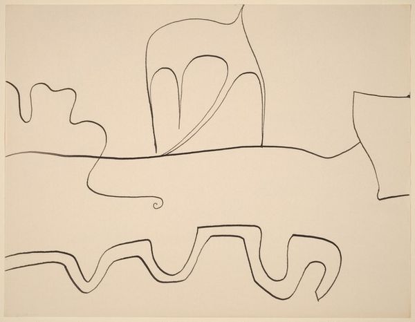 This "Untitled" drawing was made by William Baziotes. The image contains archetypal symbols that reach into the collective unconscious. At first glance, we see a horizon with rather basic shapes, perhaps a structure, set against a sky with what seems to be a human figure to the right. This basic structure evokes an unsettling familiarity, reminiscent of early human dwellings or even temples. These could be the crude markings of shelter that echo throughout time, from prehistoric cave paintings to modern urban skylines. The human figure drawn with a single line suggests a kind of primordial state, a spirit or essence rather than a concrete form. This echoes the ancient concept of the soul’s journey, a theme found in countless cultures. Consider how such shapes resurface across centuries, evolving yet retaining that primal essence, a testament to their power. The simplicity here evokes deep, subconscious recognition.