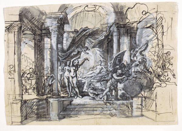 Carlo Maratti created this pen and brown ink with brown wash drawing, titled "The Rospigliosi Family Paying Homage to Pope Clement IX," which is now held at the Minneapolis Institute of Art. The drawing presents a formal scene, structured around a central act of homage, the composition carefully balanced to convey both grandeur and intimacy. Note the use of light and shadow, achieved through the brown wash, which gives depth and volume to the figures. The drawing is divided into distinct zones, each meticulously rendered, yet unified by Maratti's elegant lines. Consider how Maratti uses architectural elements to frame the figures, enhancing the sense of space and perspective. The symmetry of the columns and arches creates a visual rhythm, guiding the viewer's eye through the scene. This formal arrangement invites us to consider the dynamics of power and devotion. The artwork's structure is an integral part of its meaning, inviting viewers to contemplate the interplay between the figures and the formal language that defines their world.