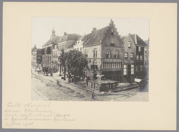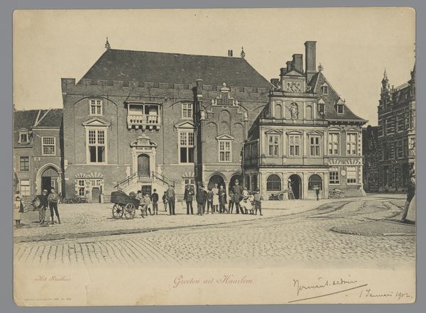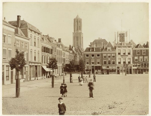 Curator: This is an image called "Raadhuis van Hildesheim," taken sometime between 1880 and 1900 by E. Mertens & Cie. What’s your immediate impression? Editor: Bleak grandeur, I'd say. The building dominates, obviously, but it feels lonely in that vast square. And the gray tones amplify this sense of solitude, like a forgotten monument. Curator: That desolation perhaps speaks to the image's historical context. This photograph likely served as a visual record of civic pride, of burgeoning city life memorializing that iconic Town Hall, during a time of intense urbanization and societal shifts. Editor: Makes sense. Yet, even though the Town Hall is a gorgeous piece of Romanesque architecture, the composition feels so…impersonal. You see the effort in rendering all those intricate architectural details. Curator: I'm picking up your threads here about “impersonal” perhaps alluding to photography's nascent phase as an accepted fine art medium at this point in time. Despite all those details meticulously rendered by photographic process, perhaps some felt that emotional essence of “Art” remained out of reach for cameras then? Editor: Precisely. The square, though large and clearly important, appears empty, save a few barely-there figures in the background. It almost emphasizes the emptiness within progress, and new urbanity, don't you think? Curator: Fascinating take. I tend to consider this image through a different lens. Photography offered ordinary folks access into realms previously restricted exclusively painters’ palettes; thus opening conversations about truth, and subjective experiences across social strata… Editor: A democratization of seeing? True! Yet even with that access, there’s a lingering melancholy. The sepia tones enhance a sense of distance, of witnessing a time long past. Curator: A valid, affecting, perspective. It calls attention towards complex issues embedded deeply around documentation, perspective, and emotional weight when representing our shared past and urban transformations! Editor: Well, that makes it something more than a simple historical document, doesn’t it? A time capsule holding complex emotions!