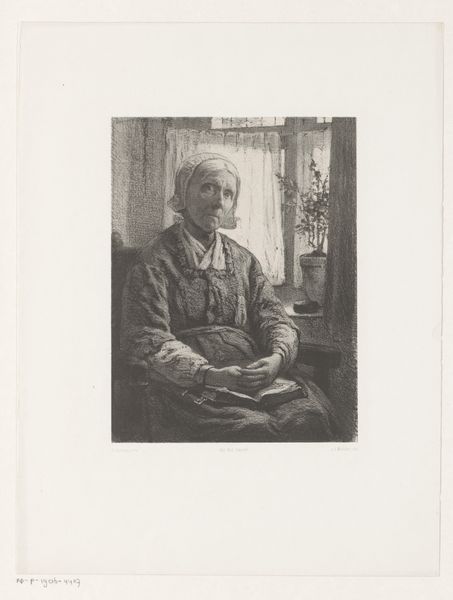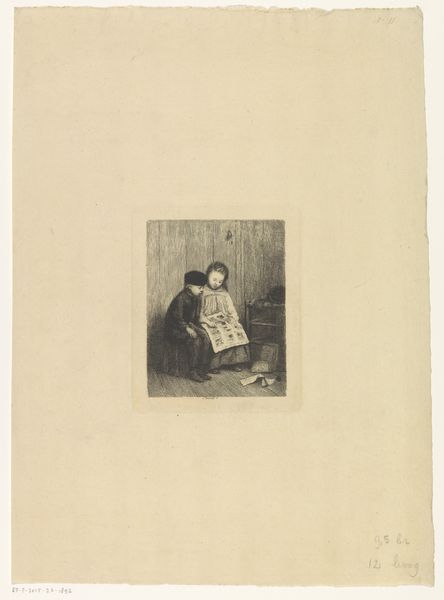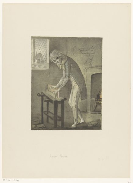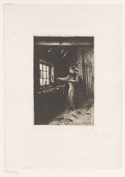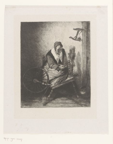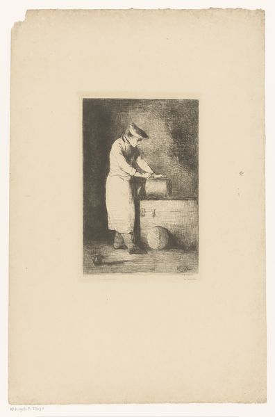 Editor: This is "Man trekt fles open" by Frederik Hendrik Weissenbruch, made sometime between 1847 and 1865. It's an engraving and etching currently held at the Rijksmuseum. The aged paper and detailed lines give it a certain melancholic feel. What stands out to you from a structural point of view? Curator: The figure's diagonal lean immediately arrests the gaze, directing it down to the focal point—the meticulous detailing around his hands struggling with the bottle. Notice the contrasting textures: the smoothness implied in the glass versus the rough fabric of his apron and cap. The background's tonal gradations create depth, isolating the subject. What I find compelling is how the artist masterfully manipulates light and shadow, emphasizing the inherent drama. Editor: It’s true; the light does guide the eye. I was so focused on the man's expression. The table seems almost like an afterthought. Is that contrast intentional? Curator: Arguably. The stark simplicity of the table and the solitary glass provide a spatial anchor, allowing the eye to appreciate the details in that compact staging. Look closely at the hatching and cross-hatching techniques Weissenbruch uses; how do they inform the perception of form and depth? The strategic omission of details in certain areas emphasizes those present in others. Editor: That’s something I hadn't considered. By not rendering every single detail, he forces us to look where he wants us to. Curator: Precisely. A refined interplay between what is shown and what remains suggested, or even absent, generates tension. It's less about depicting reality and more about orchestrating visual experience. Editor: I see now. It's not just what's *in* the artwork but how it’s all arranged. This perspective has completely changed my appreciation for this seemingly simple engraving. Curator: Indeed. The value lies not only in recognizing what is there but also in appreciating *how* it manifests before us.