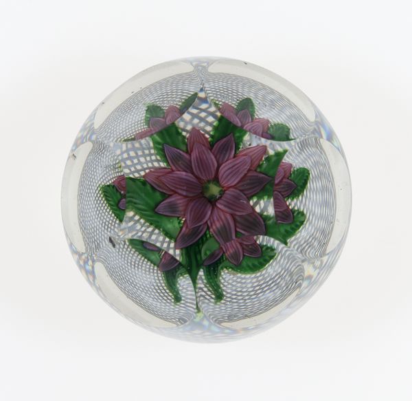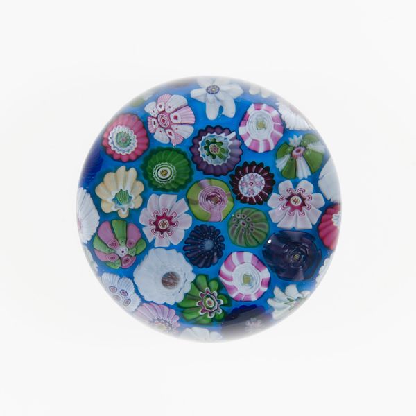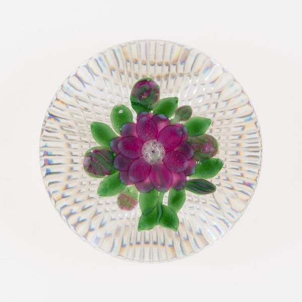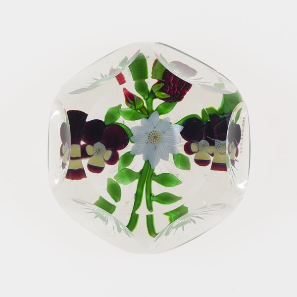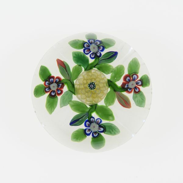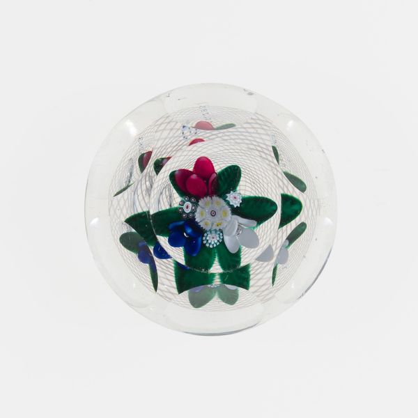 Editor: This is “Paperweight,” created by Baccarat Glassworks around 1845-1860, made from glass and paper. It's so delicate and ornate. What do you see in this piece, considering the time it was made? Curator: It’s interesting to consider its creation within the rise of industrialization. Mass production allowed for items like this to become more accessible to a burgeoning middle class, who sought objects that projected taste and refinement. Were paperweights solely functional or also status symbols? Editor: That’s a good point. I hadn't thought of that. Were paperweights displayed prominently? Curator: Often, yes. Consider how domestic spaces were curated at the time. Displaying carefully chosen objects was a way to project an image of cultural literacy and upward mobility. Think about the burgeoning department stores; these provided an arena for purchasing such symbolic items. This paperweight reflects Victorian-era ideals of domesticity. What effect might it have when juxtaposed alongside images depicting urban life and factory work? Editor: I guess it emphasizes the sharp contrasts in society then. We tend to think of the Victorians as uniform but it sounds like their society was also in flux. Curator: Precisely. So a seemingly innocent item reflects the anxieties and aspirations of a society grappling with massive changes. Looking closely changes everything. Editor: Definitely! I appreciate you helping me understand this work through a cultural lens; I see it much differently now. Curator: And I value the chance to see an item of its time given new life by each generation.