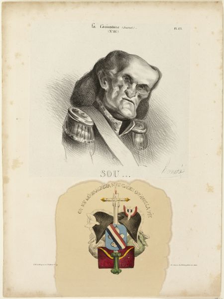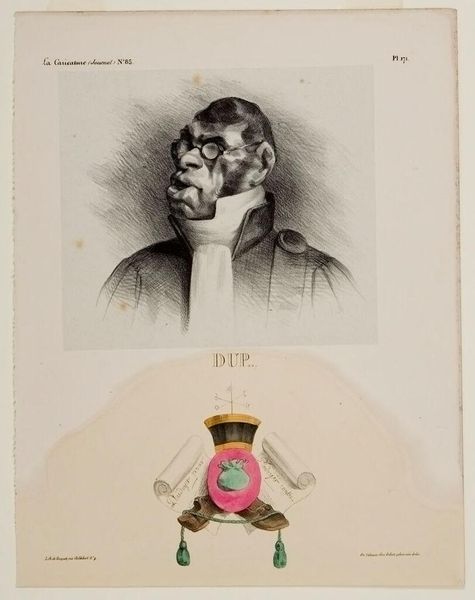Curator: Honoré Daumier's lithograph presents us with Charles de Lameth, rendered with a sharp, unflinching gaze. Editor: My first impression is one of vulnerability, almost defeat. The downward cast of his eyes and the heavy lines suggest a man burdened by something. Curator: Indeed. Daumier created this as part of his "Celebrities of the Caricature" series, a scathing commentary on political figures of the time. We should consider the historical context of Lameth’s political positions during and after the French Revolution. Editor: The symbolism below, the broken crutches, the crest… What story are they telling? It looks to me like a parody of noble heraldry, maybe implying a fall from grace. Curator: Precisely. The imagery mocks his political failings and the price of those decisions. Daumier cleverly uses these visual cues to offer a broader social critique. Editor: It’s fascinating how Daumier could condense so much social and political commentary into a single image. The pathos mixed with mockery really leaves you thinking. Curator: Absolutely. Daumier provides a space for us to analyze the complex intersection of individual choice, social position, and the tides of historical movements.