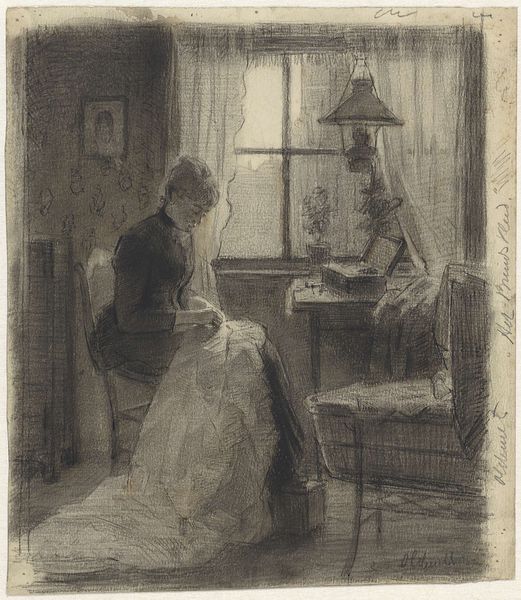 Curator: This is "Two Women Visiting," an oil on canvas work attributed to Edward Antoon Portielje, dating from circa the 19th century. It's currently held in the collection of the Minneapolis Institute of Art. Editor: It strikes me as incredibly dark. Not only the palette but there’s also a density of objects weighing down the space, all hinting at a labor of keeping. Curator: Precisely. Consider how the formal elements underscore this feeling of weight. Note the composition’s structure. The two figures are positioned asymmetrically. The lines created by their bodies and the architectural setting pull the gaze downwards, grounding it in the domestic space. Editor: While you consider composition, my eye goes to the clothing, rough spun by the look of it, that hints at hours dedicated to creation and upkeep. The room's darkness only serves to emphasize how much material maintenance occupies the space. Curator: Good point. It also affects how we read the symbolism. What at first appears to be a genre scene, perhaps influenced by earlier Dutch masters, can also be seen as a study in contrasting psychological states rendered through light and shadow. Editor: A psychological study is all well and good, but doesn’t it matter where that darkness comes from? Windows are scarce. Ventilation probably isn’t great, making the act of reading that letter, or making any kind of art, even more difficult. Curator: But look at how the light from the window frames the subjects—creating a stage on which intimacy plays out. The textural quality of the impasto further adds depth to our visual experience. Editor: Still, I can’t help but think of what women like these historically used to manufacture. Imagine the embodied labor—spinning flax, weaving cloth, then constructing clothing in poorly lit rooms. That affects one’s reading far more. Curator: It adds context. However, the brushstrokes here speak to a deeper reading: the subtle tension between figures, and the use of chiaroscuro. The painting generates its effects not just through what's depicted, but how. Editor: Perhaps... although the reality of their labor can’t simply disappear when analyzing brushstrokes. It persists, affecting the air in the room, how they move, even the way we see. Curator: Point taken. The act of observing these women now grants us a better understanding of life’s materiality for many in the past. Editor: Indeed, this piece underscores the necessity of looking closer to not only unravel forms but also reflect upon the material weight embedded in the act of art itself.