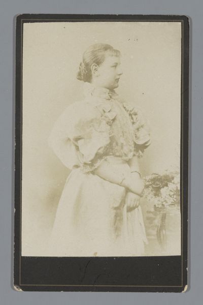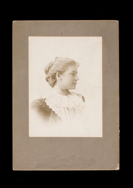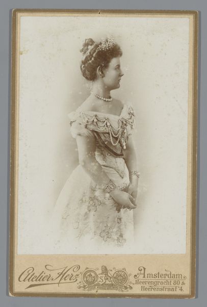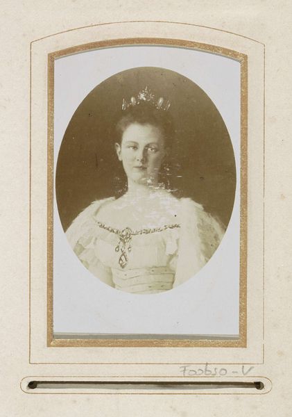 Editor: Here we have Adolphe Zimmermans’s photograph "Portret van Koningin Wilhelmina," taken in 1898. The photographic process and soft focus give it a delicate, ethereal quality. What strikes you about its visual composition? Curator: Initially, the subdued tonality, ranging from pale creams to sepia, establishes a delicate formalism, drawing attention to the sitter’s profile. Notice the deliberate arrangement—the high placement of the head within the frame isolates it, compelling the viewer to examine the contours of the face. Observe how the photographer utilized the edges of the portrait card itself—do these divisions provide framing or distraction? Editor: It does create a kind of frame within a frame, separating the monarch from any sense of setting or narrative, focusing us on her... essence? Curator: Precisely. Semiotically, we might analyze the very absence of contextual cues. This strategic decontextualization functions as a means to elevate Wilhelmina to an abstract symbol. Moreover, contemplate how Zimmermans harnesses light; a delicate illumination from an unseen source sculpts Wilhelmina’s features, rendering a softness but also adding depth to the subtle gradations of tone and texture, particularly evident in the rendering of the hair. What emotional valence emerges through these visual means? Editor: I suppose it lends the photograph a formal reserve while hinting at a latent inner life, especially visible in the texture and depth of her gaze and expression. Curator: Indeed. This subtle visual paradox activates an engagement that lingers far beyond the photographic moment, thereby asserting a formal reading of an established sovereign. A portrait isn’t always the image we make of our subject, but the relationship of parts in its structure. Editor: This analysis reframed my understanding from mere representation to an exercise in photographic form and language. I will carry it in my studies.