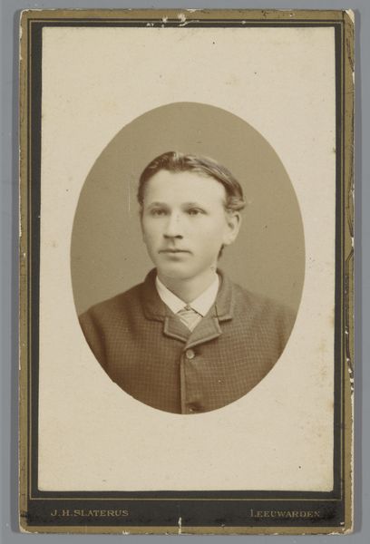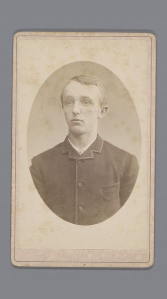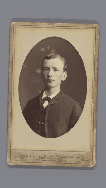 Willem Gerhardus Kuijer created this photographic portrait of an unknown man using the carte-de-visite technique. The composition centers on the oval frame that captures the subject’s likeness. Here, light and shadow are used to model the figure’s face and form, giving it a three-dimensional presence despite the photograph’s diminutive scale. The sepia tones imbue the image with a sense of nostalgia. This portrait raises questions about identity, representation, and the cultural codes embedded within the photographic medium. Who was this man, and what might his social standing have been? What stories do the formal elements of attire and pose tell us about the sitter’s self-perception and the photographer’s intention? Consider how the photograph's formal qualities invite us to reflect on the construction of identity and meaning. The sitter, now anonymous, gains a spectral presence through the enduring medium of photography.