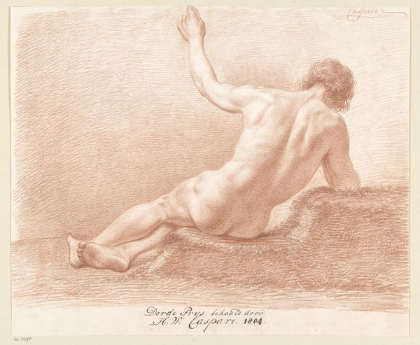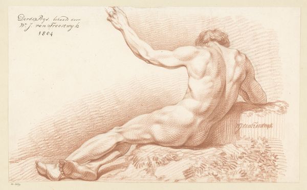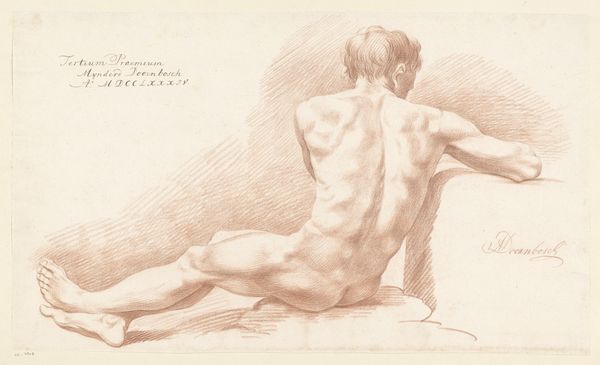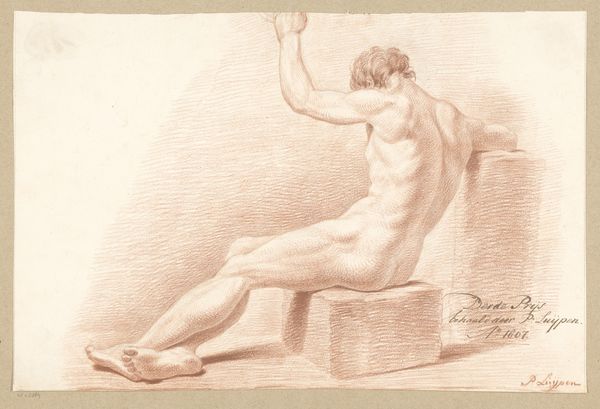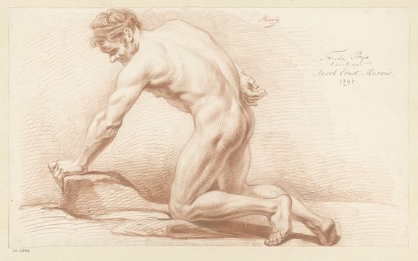This red chalk drawing of a seated male nude, seen from the side, was created by Jacob Ernst Marcus in 1798. The figure leans on a rough-hewn stone, a pose reminiscent of classical sculptures of river gods or reclining heroes. Consider the position of the figure's arm, reaching upwards and outwards while resting on the stone. This gesture, repeated across centuries, echoes in depictions of Atlas bearing the heavens, and even finds resonance in Christian iconography, symbolizing burden and resilience. It is a motif that speaks of strength, both physical and existential. The placement of the figure upon the stone is also important, creating a visual language of vulnerability. The man's defenselessness echoes throughout art history and connects with our own subconscious understanding of strength and adversity. The symbols within this artwork are constantly evolving, constantly becoming, as they resurface, transform, and embrace new meanings within varying historical contexts.