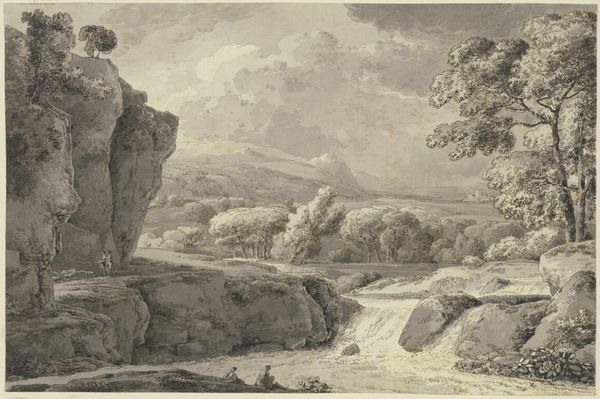Curator: This landscape print, titled "Heuvelachtig landschap met wandelaar," was created by Martinus Antonius Kuytenbrouwer Jr. sometime between 1831 and 1897. It employs techniques of etching, drawing and woodcut. Editor: The meticulous detail and composition create a captivating scene; it almost feels as though a somber moment is being shared. Curator: Indeed, that feeling is amplified by its historical context, coming at a time when industrialization across Europe was shifting how people related to nature. This sort of image, imbued with romantic ideals of solitary connection with nature, can be seen as a counter-narrative to capitalist exploitation. Who gets to experience the 'sublime' wilderness is, after all, always a political question. Editor: I find the deployment of visual forms here intriguing, especially the relationship between foreground and background. The use of hatching and cross-hatching articulates textures that gives great clarity. The rocky face to the right—a marvelously worked textural passage. I wonder what one may surmise by applying a structuralist interpretation to its composition? Curator: Well, when thinking about structuralism, it's essential to ask how the print functions as a signifier, contributing to broader ideological structures related to landscape and identity. Notice how the single walker becomes representative, embodying themes of human versus the untamed landscape. The figure's solitary state suggests something akin to isolation that becomes more apparent with each passing year into the artist's life. Editor: You’re making me see those tensions so clearly! Curator: And this also connects to other broader social anxieties of the period; such works can become interesting avenues for looking at race and gender during periods of rapid socio-economic transformation. Editor: It’s true that paying attention to that broader cultural context reframes how one looks at an individual and their subjective experiences in a space like this. It challenges the singular reading of nature. Thanks for this dialogue! Curator: It works both ways; thank you for prompting new ideas. Hopefully, it offered you and our listeners fresh pathways into viewing the image today!