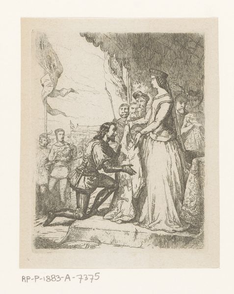 This print shows a soldier standing next to a woman seated beneath a gallows, created by Guillaume Joseph Vertommen. Vertommen lived in a time of great social change across Europe. His identity as a Belgian artist is important: Belgium was undergoing a period of cultural and national self-definition. In this image, a soldier appears to be in conversation with a woman, close to a gallows. The setting immediately invokes themes of justice, power, and perhaps despair. The woman, seated, seems vulnerable, while the soldier’s stance suggests authority, creating a visual dialogue about gender and power. The presence of the gallows looms large, symbolizing the ever-present threat of state-sanctioned violence and its disproportionate impact on the marginalized. Vertommen’s choice to depict such a scene invites us to reflect on the human cost of conflict and the subtle ways in which power dynamics play out in everyday life. It reminds us of the emotional and personal dimensions of historical events.