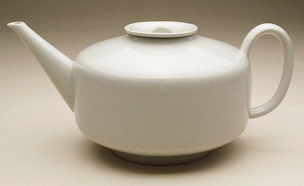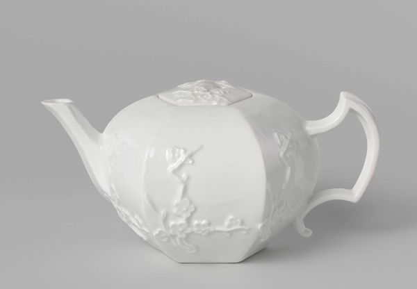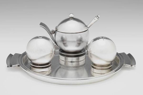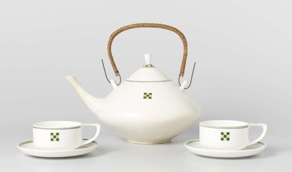 Curator: Here we have a ceramic “Cup” by Paul Schreckengost, created around 1938. You can find this beautiful piece right here at the Minneapolis Institute of Art. What are your first thoughts? Editor: It feels… strangely futuristic, but also restrained. The white ceramic is so pristine, almost sterile, yet those silver accents hint at luxury. It has a very interesting interplay of form, mainly circles, cut across with some bold straight lines on the handles. Curator: Absolutely. Schreckengost was deeply involved in the Art Deco movement. The streamlining, the geometric forms – they speak of a modern era trying to reinvent itself, while the material roots it in an almost primal, handcrafted world. Editor: Right, it evokes the streamlined trains and architecture of the 1930s, a moment when industrial design aspired to be art. The circle – repeated in the pot's body, handle, and in the cups themselves—traditionally represents wholeness. Maybe the maker hoped for this piece to promote a sense of harmony, which, during the late 30s, pre-WWII, might suggest more than a peaceful coffee break. Curator: I see your point. Consider the ritual of sharing tea or coffee, deeply rooted in social custom across cultures. Placing such familiar rituals inside this Art Deco vocabulary creates an intriguing dialogue between aspiration, cultural memory, and even technological progress. Each element – from the severe silver lines to the warm curve of the ceramic form– creates an icon of function meeting futurism. Editor: What an exquisite exercise in seeing! From a formal point of view, thinking through its structure and symbolic echoes reveals an amazing snapshot of both optimism and underlying unease through familiar daily objects.