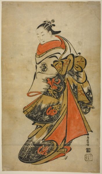 Editor: So, this is "An Oiran Standing, a Pipe in Her right Hand, and Turning to Look Behind over Her Shoulder" by Torii Kiyomasu I, dating from 1695 to 1715. It's a woodblock print – striking, almost graphic, with those bold lines. What do you make of it? Curator: It’s as if Kiyomasu has captured a fleeting moment, hasn't he? The oiran, caught in this backward glance, almost seems startled. What stories, I wonder, do those eyes hold? Ukiyo-e, like this, often presents us with the ‘floating world’ – the ephemeral pleasures, the theater, the courtesans…But there's always that subtle undercurrent of something deeper, don't you think? A kind of melancholy. Look at the precise lines; they define the fabric’s intricate patterns and somehow intensify the human form beneath it all. Don’t you just wonder what caused her to turn? Editor: Melancholy, that's interesting. I was so focused on the strong lines and patterns. So, the print is about capturing a specific type of beauty standard, but suggesting transience too? Curator: Exactly. It is about that dance between permanence, in the art form, and the fleeting beauty that it captures. Ukiyo-e was often commissioned; prints like this would circulate among the merchant class, a snapshot of desirable culture available to many. It democratized art, in a way. Each element carries significance: the pipe she holds, her elaborate kimono. They speak of status, leisure, and the performance of beauty itself. Are we looking at the art, or is the oiran performing a piece for the art? Editor: Wow, I'd never considered that layered reading. Thanks for sharing your perspective. Curator: My pleasure. It's in the looking, and then looking again, that art truly breathes. I always think we take a small part of it with us, changed slightly, you know?