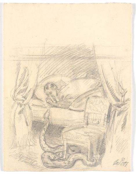 Curator: At first glance, this drawing has an unexpectedly whimsical feel given its subject. The drooping angel, the scraggly scholar—it feels almost like a satirical comment, wouldn't you say? Editor: I do agree, the initial impact is quite jarring. We're viewing a pencil drawing titled "Humoristische Initiale F_ Lesender Gelehrter, an dessen F-förmigen Pult ein erhängter Putto baumelt" which roughly translates to "Humorous Initial F: A Reading Scholar at Whose F-Shaped Desk a Hanged Putto Dangles". It's by Victor Müller and currently resides at the Städel Museum. I'm intrigued by how Victor Müller engages with institutional critique. Curator: "Humorous" is right! This really twists established iconography on its head, doesn't it? The scholar, usually a figure of reverence and wisdom, is portrayed as almost grotesque. That hooked nose, the exaggerated features… it disrupts the whole notion of scholarly authority. Editor: And look at that putto. Typically, putti symbolize divine love, inspiration. Here? He’s practically a decorative element, nonchalantly hanging, his symbolism voided. The imagery here really interrogates academic symbolism through sharp caricatures. Is the putto meant to mirror Icarus’ hubris perhaps, being punished by literally dangling at the desk? Curator: Possibly. Or maybe he is symbolizing some kind of forgotten tradition or even a suppressed aspect of creativity? Hanging there is reminiscent of earlier forms of pagan sacrifices, in the place of sacred and sacrificial power. Consider how the visual traditions of Christian art may carry deeper folk traditions, of subjugation but also perhaps the inversion or suppression of traditions that the artist might also explore and be aware of! Editor: These figures certainly prompt a conversation about how images serve socio-cultural expectations. Perhaps he's hinting at the absurdity of rigid adherence to traditional forms. The artist himself existing in that same Academic tradition of figuration but also providing a subtle deconstruction, I find truly provocative. Curator: Right, it certainly pushes boundaries and asks what these images truly evoke when freed from prescribed religious contexts. Food for thought as we turn our gaze to other works in the museum today. Editor: Indeed, a testament to how artists throughout history engaged in acts of social and artistic interpretation.