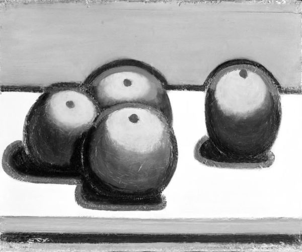 Curator: Today we are looking at “Apples” by Gustave Courbet, estimated to be from between 1850 and 1899. This charcoal drawing currently resides in the Metropolitan Museum of Art. Editor: It's interesting how such a simple subject can feel so substantial. The texture of the charcoal really makes the apples appear weighty, almost monumental, despite being just…apples. What is particularly striking to you in this piece? Curator: Consider how Courbet employed charcoal. Note the deep, velvety blacks contrasted against the almost blinding whites. This strong chiaroscuro, this contrast, serves to define the forms and give them volume. Further, observe the hatching and cross-hatching techniques. Where do you see the darkest concentrations of charcoal and how does that affect your reading of the form? Editor: Definitely at the back, to define the shape against what appears to be the wall. Curator: Precisely. Courbet manipulates value to create depth, placing the apples firmly within the picture plane, whilst also calling attention to the picture's materiality itself. It is charcoal on paper, yet he creates the illusion of volume. What philosophical concepts could relate to what the painting is showing? Editor: Maybe the essence of something, what it is made of, versus what it appears to be to the viewer. So how it is a balance between the artist's hand and the raw medium. Curator: Well put. And that push and pull is precisely where much of the dynamism lies. It exists, paradoxically, on a very quiet and still plane. This exercise has reaffirmed the significance of examining the interplay between form and content. The inherent qualities of the medium dictates so much! Editor: Absolutely, I now perceive this art work very differently, more clearly than I initially had. It encourages me to look beyond representation.
