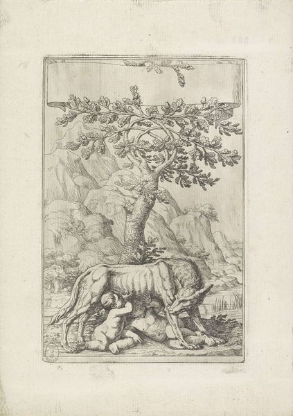 Curator: Well, look at this intriguing slice of life captured by Hendrik Godart de Marée between 1752 and 1783! The title, "Pakezel op landweg met zich ontlastende man" suggests it's... earthy. Editor: Earthy is an understatement. My first thought: awkward! An ordinary donkey with a loaded pack, juxtaposed against... that. It certainly grabs your attention. A man relieving himself... it’s bold. Curator: Exactly! It’s a genre painting captured through the crisp lines of an engraving. I mean, landscape in the Baroque style, but with this stark realism breaking through. The artist really had a thing for balancing nature with the frankly unavoidable realities of being human, didn’t he? Editor: There's something fascinating in immortalizing this mundane, often taboo act. Historically, the simple act of excretion has so many meanings, ranging from fertility rites to even warding off the evil eye! Did the artist purposefully select a donkey as well as an ironic image reflecting stubbornness as a base instinct of burden as part of being, also revealing himself at the root of all. The barrel above perhaps showing all you drink and eat, has to go somewhere eventually! Curator: Interesting, I had simply viewed it as quite literally, the shittiness of existence we're carrying along! Though, a lot of that nuance would certainly be missed by a modern audience lacking the contemporary iconography, eh? I love the tree though. I’m thinking how it anchors the composition, yet its dark foliage partially conceals this bloke in his moment... it is a complex dichotomy indeed, a push and pull that emphasizes the themes in place here of the figure against an open-yet-secluded landscape. Editor: Concealment and revelation are the key here. It reminds us that the everyday, the primal, always exists, often hidden in plain sight, in contrast with the conventional, pristine landscapes. But still with his ass right there exposed. He is not a figure or face to make a comparison. His is as anonymous, as invisible as we pretend the act to be. Curator: Invisible is arguable when hung in a gallery. Editor: True, true, that's how memory, or rather recognition, functions! Now it carries meaning for all that witness! That’s where art transcends reality. A candid bathroom break captured, an ode to existence if you will. Curator: Wonderful—now that's something to chew on as we stroll onward. Thanks for, ahem, lightening the mood!
