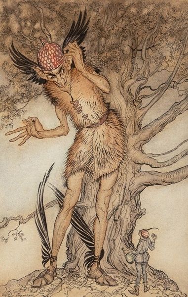 Margaret Evans Price made this illustration, Jack and the giant Cormoran, with ink and watercolor. There’s a real softness to the line work that suggests it was a playful, almost intuitive process. The material quality of the artwork is lovely; the transparent washes of color create a sense of depth, especially in the giant’s flesh, while the dry brushwork suggests texture in the giant's fur tunic and the surrounding foliage. The piece has an airy, fairytale quality, but the giant also looks kinda goofy. Notice the way the ink lines are so delicate, particularly around the giant’s toes. It gives him this almost childlike quality which is so at odds with the threat of violence that he implies, holding that enormous club. Price's illustrations remind me of the early work of Arthur Rackham. Like Rackham, she embraces ambiguity, allowing the fantastical to blend with the everyday, inviting us to question our perceptions of reality and the stories we tell ourselves.