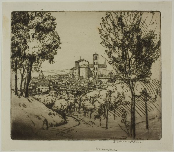Curator: Right, let’s immerse ourselves in this cityscape—it’s Joseph Pennell’s etching of San Gimignano, crafted in 1883. It is a captivating drawing rendered in ink. I wonder what impressions arise for you. Editor: At first blush, there’s a melancholy romance to it. The towers reaching towards a sky that seems both vast and burdened. It’s like a memory trying to hold onto something ancient and beautiful, before it all fades. Curator: I can sense that sentiment in the image too, absolutely! Towers piercing the sky, yes, each one seemingly asserting its place. Pennell really captured that vertical thrust against the rather softly rendered, almost melting landscape. They serve, still, as watchtowers, their existence forever embedded in the heritage of their locations. Editor: It’s interesting to me that you bring up them serving as watchtowers since these towers do stand as phallic symbols which would imply safety, leadership, and patriarchal societal expectations for the generations living around the towers in question. Curator: That’s interesting—but how do we balance what Pennell might have consciously been trying to convey versus what deeper, almost primal, resonances these architectural shapes evoke? Perhaps it’s both! What do you sense in the details, those little visual choices Pennell made? Editor: The foliage in the foreground seems intentionally loose and unkempt, almost like a curtain veiling the fortified settlement, and also suggesting vulnerability of those living on that side of the hillside near the settlement. Perhaps it reveals that vulnerability more by making the choice of that foreground in comparison to the solid, secured settlement, Curator: That sense of the natural world framing human endeavors, almost like life is growing *around* those imposing structures. In terms of pure aesthetic delight, what really gets me is the sheer textural variety he achieves just through etching. He conjures everything from rough stone to almost silken leaves. Editor: Indeed! The symbolism coupled with technique, renders it more potent. I keep thinking of how human ambition perpetually seeks to transcend mortality, but inevitably the weight of time, culture, expectation and history bear down on any form that arises from our existence. This image captures both of these warring aspects so profoundly. Curator: Ultimately, then, perhaps the charm of San Gimignano as revealed by Pennell is not just the buildings, or even the time period, but rather this quiet moment where art allows the conversation between past and future, ambition and decline, all within the framework of one hillside to gently whisper through the ages. Editor: Precisely. It reminds us of art's uncanny ability to become more than just a document; a living, breathing echo.