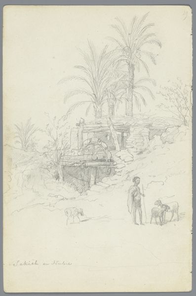 Editor: This is Denman Waldo Ross's sketch, "Street Scene with Figures, Algeria (?)." It's a pencil drawing, and it feels so immediate, almost like a memory fading. What do you see in this fleeting image? Curator: The palm tree, though lightly drawn, is a powerful symbol here. Across cultures, palms represent victory, peace, and eternal life. Coupled with the North African setting, it evokes centuries of trade, conquest, and cultural exchange, doesn't it? Editor: It does! It's strange to think a simple tree can carry all that weight. Curator: Indeed. A single image invites reflection on histories, narratives, and our shared human story. Editor: I'll definitely look at seemingly simple images differently now.