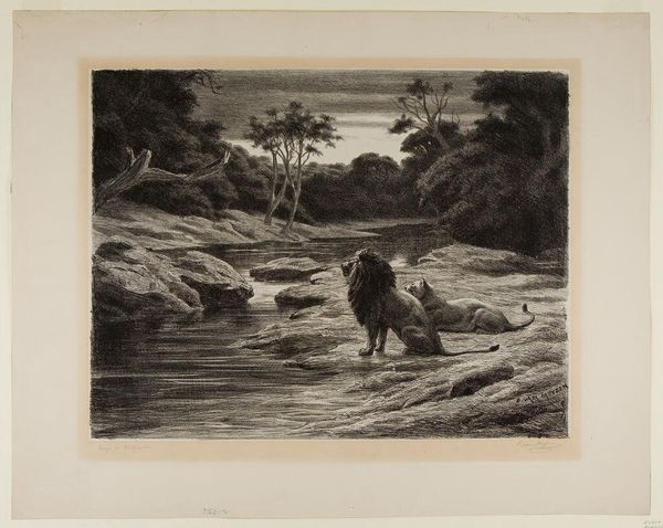 Curator: Ferdinand Philippe Louis Charles, duc d'Orléans created this print, "Fox Devouring His Prey." Editor: What strikes me is the stark contrast of light and shadow, lending the scene a predatory urgency. The fox itself is captured mid-stride, a dynamic diagonal slicing through the composition. Curator: Indeed. Consider the context: 1830 France. The Duke, though royalty, participated in Romanticism's fascination with the raw power of nature. This work reflects a shift from idealized landscapes to grittier realities. Editor: The textures! The delicate hatching builds a palpable sense of the fox's fur, the rough earth, and the still water. It is almost tangible. Curator: And the symbolism cannot be ignored. The fox, a creature of cunning and survival, preying on the vulnerable. Perhaps a commentary on social hierarchies? Editor: It is a raw depiction, and yet, there is grace in the line work that tempers the brutality. Curator: Ultimately, this piece captures a moment of primal drama. Editor: One that's both unsettling and mesmerizing, a tension that keeps us looking.