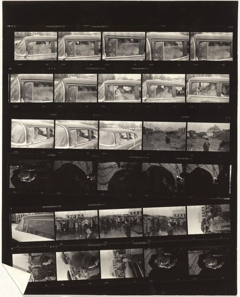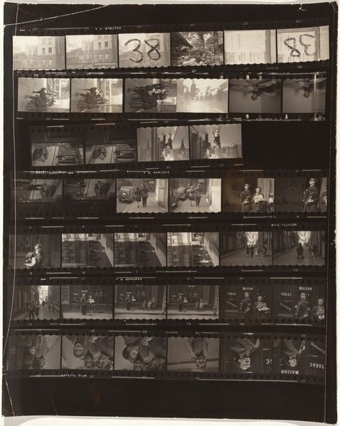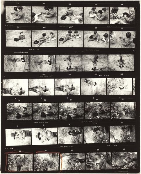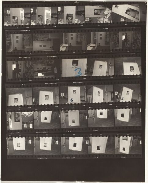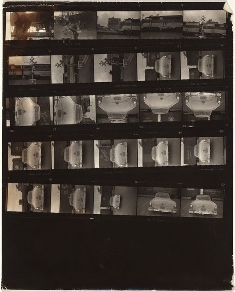 Robert Frank made this contact sheet, ‘Robert Motherwell no number,’ using photographic film and traditional darkroom processes. This wasn't about a singular precious image, but about the nuts and bolts of making. The raw, uncut strip offers a peek into Frank's photographic method. The sprocket holes, frame numbers, and manufacturer markings, typically cropped out, are all visible, revealing the labor behind the final product. The photos show artist Robert Motherwell at work, but more interesting is the working process of Frank himself. Contact sheets were a common tool, a means for photographers to review their work, select images, and plan prints. In this case, the contact sheet itself becomes the artwork, elevating a utilitarian object to a subject of artistic interest. This reframing challenges traditional distinctions between the artistic image and the means of its production, inviting us to consider the broader context of photographic practice.