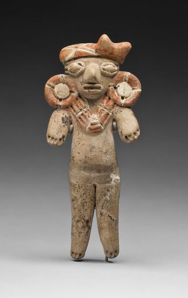 Curator: Welcome! Take a moment to observe this Standing Warrior Figure with Removable Mask and Headdress. It's believed to have been created between 700 and 1000 by the Classic Veracruz culture. Editor: There's a distinct feeling of contained power emanating from it. The earth tones are so muted, creating a really grounded feeling, while the layered forms suggest monumentality. Curator: Precisely. Note how the figure, rendered in ceramic, adopts a strong, frontal pose. This symmetry isn't merely aesthetic; it signifies ritual power and divine authority. Consider that removable mask; what stories might it conceal, what transformations does it signify? Editor: I am immediately drawn to the mask. The features seem exaggerated, deliberately grotesque almost, standing in contrast to the composed expression of the figure beneath the headdress. What's that about? Curator: It highlights a crucial aspect of Mesoamerican belief – the ability to transcend earthly identity. Masks were transformative objects, allowing the wearer to embody deities or tap into ancestral energies. This warrior's true self might only be revealed through ritual transformation. The attire also plays a role. Editor: Look at those intricate geometric patterns, repeating everywhere. They give the statue such detail and suggest depth beyond just this plain object. Curator: Those patterns echo cosmic principles, likely referencing creation myths or calendrical cycles central to their worldview. Every design decision would reinforce a precise message to those initiated in their meanings. The headdress as well probably marks him with status, knowledge or ability. Editor: So, not merely a sculpture then, but a repository of complex symbolic codes. I find it fascinating how an object crafted from clay can convey so much about a civilization's beliefs. Curator: Exactly! It offers us a tantalizing peek into the spiritual world of the Classic Veracruz people, where art served as a gateway to communicate to Gods and ancestral truths. It really bridges that cultural divide when you consider all the symbols it holds. Editor: It shifts the emphasis—art isn’t only what we *see* but also what it makes us *believe.* Curator: A powerful notion, encapsulated in this silent, watchful warrior. Editor: Indeed. And the interplay between form and deeper cultural significance makes it truly resonate across centuries.