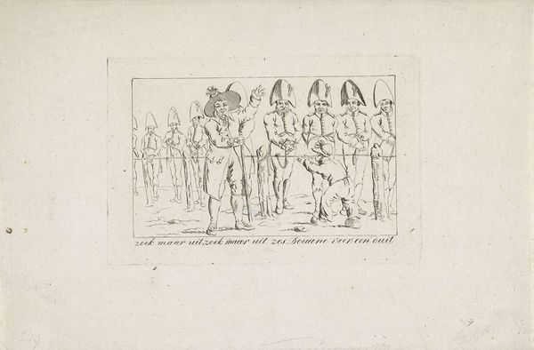 Curator: This drawing, in pen and ink, comes from the hand of Henricus Wilhelmus Couwenberg and is titled "Man met tulband zittend in kleermakerszit en 19 soldaten die allen een fez dragen," which translates to "Man with turban sitting cross-legged and 19 soldiers all wearing a fez". It dates from somewhere between 1830 and 1845. Editor: My first impression is a stage, meticulously set. The man in the turban radiates a still calmness, while the soldiers appear almost like identical props—interesting contrast. Curator: It's a fascinating example of Orientalism, a genre reflecting European artists' romanticized or stereotyped views of the Middle East and North Africa. Consider how power dynamics may be playing out, with the single, elevated man versus the regimented soldiers. Editor: Absolutely. The turban itself speaks volumes, marking the central figure's status, perhaps wisdom or spiritual authority. The fezzes on the soldiers create a sense of uniformity, a collective identity willingly assumed. The repetition serves to diminish individuality in favor of group belonging. Curator: That uniform appearance echoes contemporary military trends in Europe at the time. What seems exotic on the surface might reflect European socio-political fascination with control and order, projected onto the "Orient." The question, though, is what purpose did it serve. The drawing feels very private. Editor: Notice the interior details - a floral, ornamental motif repeated within the room, hinting at opulence and exoticism, common themes within Orientalist works. They represent something greater about both class, but a fascination of culture as seen from abroad. Curator: Exactly, the drawing's public life would then perpetuate specific perceptions of those cultures back in Europe through these artistic choices. Think of it as cultural dialogue—albeit potentially flawed and certainly biased—conducted via artistic representation. It certainly evokes larger conversations of art’s purpose as either reflection or a driver of public sentiment. Editor: The visual language it utilizes—the turban, the fez, the setting—acts as cultural shorthand. As an audience, we need to unpack those loaded symbols carefully, recognizing the image may perpetuate certain stories. Curator: Thank you. Editor: Indeed, thank you.