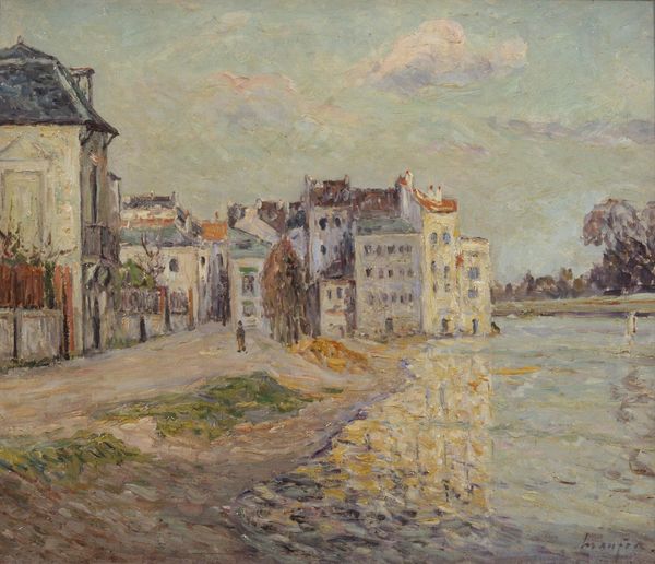 Curator: Look at the gorgeous "The Bridge at Moret at Sunset" by Alfred Sisley, completed in 1892 using oil paint, as many Impressionist pieces were. There's a dreamy quality about it. Editor: Yes, those blues and violets immediately give me a melancholy feel, and I notice the thick application of the paint on the water’s surface creating visual texture. The sky seems heavy. What’s the historical story? Curator: Sisley's position within Impressionism is quite fascinating; often somewhat overshadowed, but his dedication to landscape and his Anglo-French identity positioned him uniquely. He explored ideas of belonging and observation that are crucial to understanding his approach to rendering place and time. I think about it in the context of displacement, his commitment to observing changing conditions feels especially pointed. Editor: And those changing conditions speak to the industrialization of the time. I’m looking at the materials themselves: the canvas, the processed oil paints—these were commodities circulating in a rapidly changing world. The brushstrokes, too, reflect the speed and rhythms of modern life. We must also acknowledge that pigments were being artificially created through the labor of chemical processing, changing art forever. Curator: Exactly. Consider that Sisley returned to Moret repeatedly. These depictions weren't just about capturing a scene; they're studies of place and memory. Also, consider his position of being caught between nations: born in Paris but of British parentage. Editor: He transforms it, literally, by painting it through his eyes and experiences with material conditions informing his view. The commodification of art, though, gave many artists the opportunities that otherwise wouldn't exist. The bridge becomes not just a scene, but also an element of labor and of transformation itself! Curator: And as a social space—a point of transit but also of encounter—the bridge facilitates human exchange in a budding era of globalization. This piece invites us to look deeper into our relationship to the environment and our place within it, which, regardless of our backgrounds, are pertinent for conversations today. Editor: Well put. Sisley's commitment to capturing ephemeral conditions through labor offers us the chance to connect past processes and present issues, but more importantly, it reminds us to consider materials. Curator: Agreed; an enriching convergence of thought, indeed.