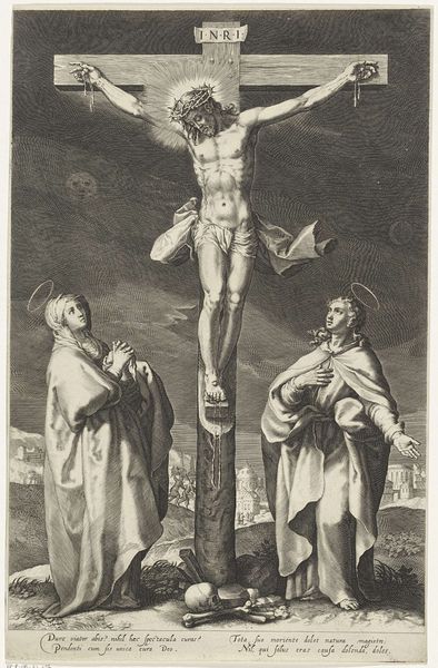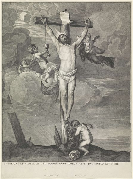 Pieter van Sompel created this engraving of the Crucifixion in the early 17th century, after a painting by Peter Paul Rubens. Depicting Christ on the cross, the image reflects both religious devotion and the complex political landscape of the time. Engravings like this one played a crucial role in disseminating artistic ideas across Europe. Printed in the Netherlands, this work shows the influence of the Catholic Reformation and the ways in which artists and institutions helped to promote certain religious and political views. The detailed rendering of Christ's suffering, combined with the classical composition, demonstrates how artists sought to engage viewers emotionally and intellectually. This was a time of religious conflict and rapidly solidifying national identities. The image's blend of religious fervor and classical style speaks to the cultural tensions of the era. To fully appreciate this work, we can consult historical archives, religious texts, and studies of print culture. These resources shed light on the artist’s intentions and the social context in which the image was produced and consumed. The meaning of art always depends on its historical and institutional circumstances.