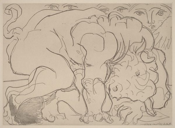Editor: This ink drawing on paper by Leo Gestel, made around 1931-1933, is titled 'Venus Vignet voor boek 'L'art Hollandais contemporain' van Paul Fierens', which roughly translates to 'Venus Vignette for Paul Fierens' book 'Contemporary Dutch Art'.' It features a reclining nude figure alongside two horses and two doves. The high contrast and bold outlines give it a graphic quality. What symbols and imagery do you notice? Curator: The power of the classical world certainly pulses through this image. Gestel links the idea of Venus, goddess of love and beauty, with symbols of peace and power – the doves, traditionally associated with the goddess, and the horses, emblems of strength and vitality. It almost reads as an exploration of idealized feminine strength in a modern context. Do you see the geometric shapes integrated within the waves? Editor: Yes, I do. The geometric waves contrast the otherwise more fluid lines of the figure, birds, and horses, but I don't see the connection, what is it there for? Curator: These recurring shapes evoke the mechanization and the streamlined aesthetic of the era – the dawning age of machines – intruding upon, perhaps even supporting, the organic world. Consider this interplay: Venus, an emblem of ancient ideals, existing within the rapidly changing landscape of the 20th century, surrounded by a stark simplification of the natural world. It suggests the artist’s perspective on timeless beauty navigating modernity. Editor: So, it's about reinterpreting classical symbols for a modern audience. I initially saw it as a simple nude, but I now understand the deeper conversation about cultural memory and modernity through those symbols. Curator: Exactly! Gestel isn't just representing; he's reinterpreting and asking us to reconsider the emotional and psychological weight these age-old figures still carry. Editor: This makes me want to go seek out more of Gestel's art! I am thankful to know more about what cultural memory has to say to our world today.
