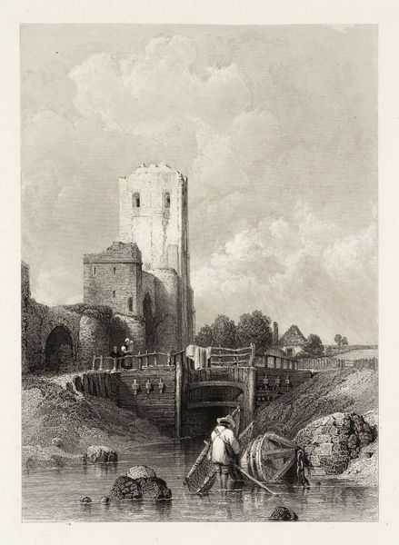 Curator: Look at this etching, likely from the 17th century, attributed to Jean Morin after Cornelis van Poelenburgh. Note the fine lines, the textures created by the burin. Editor: It strikes me as a scene of melancholic grandeur. The crumbling ruins evoke a sense of time's passage, of civilizations lost. Curator: Indeed, consider the availability of paper, the process of etching—a copper plate, acid, and then the press—these were not insignificant undertakings. The print would have circulated, carrying this vision of the Roman campagna to a wider audience. Editor: And what a vision. The ruined buildings aren’t just stones; they’re symbols of a fallen empire, perhaps a memento mori. The seated figure adds to this feeling, a contemplative witness to history. Curator: I agree. The print medium itself speaks to a certain democratizing of art. This image, reproduced many times, becomes available to many viewers, shaping perceptions and understandings of place and history. Editor: It’s a beautiful intersection of skill and symbolic weight, a reminder that even in ruin, there's something powerful to be found. Curator: It's a reminder that art is fundamentally a material process, even as it shapes cultural meaning.