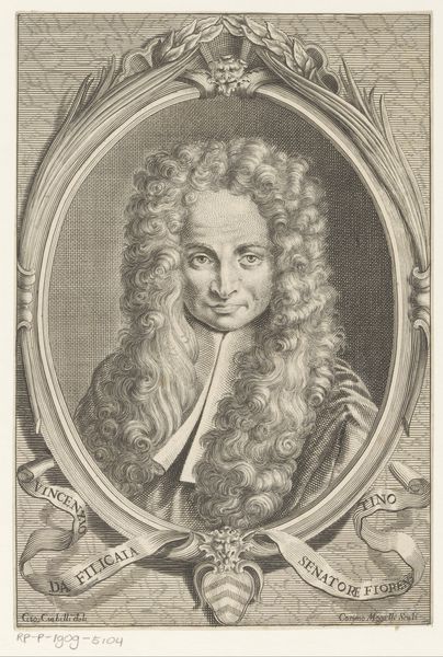 Curator: Editor: This is a portrait engraving of Balthazar Huydecoper, created between 1715 and 1732 by Arnoud van Halen. It strikes me as quite formal, even staged, typical of Baroque portraiture I suppose. How do you interpret this work, beyond its obvious function as a likeness? Curator: Absolutely. This image offers a glimpse into the societal structures of the Dutch Golden Age and beyond. Think about who was being portrayed and how they chose to be portrayed. It wasn't just about capturing their physical appearance, was it? Editor: Not at all. The clothing, the frame, even the presence of the lyre suggests a status and connection to the arts...almost performative. Curator: Precisely! Huydecoper was from a well-known family, a figure of authority, scholarship, and likely influence. The trappings of status - the wig, the ornamented frame - are communicating power. But I'd push you further: Whose power? And at what cost to those excluded from such representations? Editor: It highlights a very select, elite group while invisibilizing everyone else. And the formality feels like a reinforcement of social hierarchy. Curator: Exactly! By understanding portraiture through this lens, we can better assess the power dynamics at play and acknowledge voices not included in this story. The image also acts as an important historical artefact to examine social relations. Do you agree? Editor: That makes perfect sense. Looking at art with an eye towards the power structures at play is fascinating. Thank you for sharing your perspective. Curator: And thank you for making space to have the discussion!