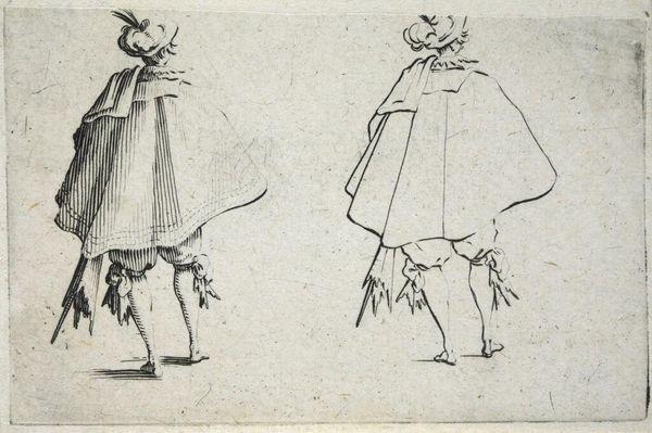 Curator: This etching by Jacques Callot, titled "Man Seen from the Back, His Right Hand Extended," captures two figures in a way that feels both studied and gestural. Editor: My first thought? It's like seeing a mime caught mid-act! There's something about the pose, the hat, the implied stage. Is he offering a grand pronouncement or just hailing a cab in an empty street? Curator: It's fascinating to consider Callot's exploration of the male figure, particularly through the lens of performance and social status. The clothing, the posture – they signify a certain privilege, perhaps even a theatrical role within society. Editor: Right, like those Commedia dell'arte characters he was so into. It’s almost as if he's showing us different facets of the same character, frozen in slightly different moments. I wonder what story he's trying to tell? Or maybe he just liked drawing fancy clothes. Curator: Callot's work often reflects the sociopolitical tensions of his time, and I see this piece as an example of how identity is constructed and performed within the context of social expectations. Editor: So, more than just a fancy hat? It's deeper than it looks then; but I'm sticking with my mime theory.