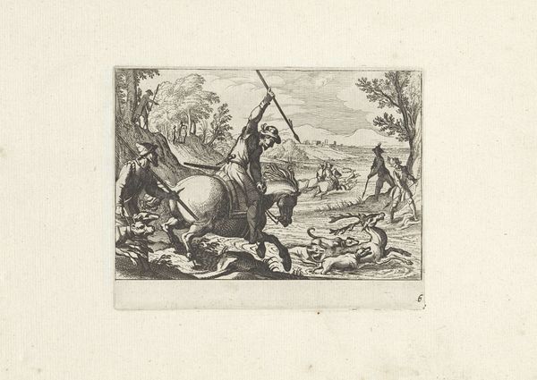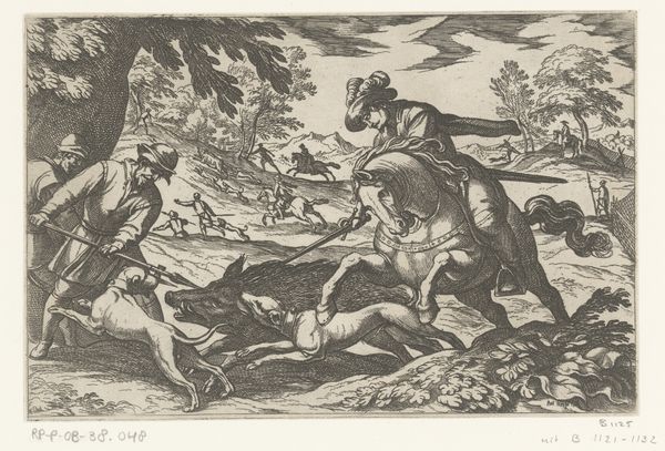 This is "Jacht op everzwijnen", or "boar hunt", an etching made by Antonio Tempesta around the turn of the 17th century, and it is held at the Rijksmuseum. Immediately, the eye is drawn to the intricate dance of lines that animate the scene, a flurry of activity as hunters and hounds converge upon their prey. Tempesta masterfully employs line to convey motion and texture. The frenzied energy is almost palpable. We might consider here the semiotic function of these lines; they are not merely descriptive but active, embodying the hunt's chaotic struggle. The landscape, rendered with detailed precision, acts as a stage for this deadly ballet. Note how the composition guides our gaze from the foreground's immediate skirmish to the distant mountains, creating depth and a sense of boundless pursuit. The scene's relentless movement and the stark contrast of light and shadow not only capture the literal hunt but also suggest deeper philosophical inquiries into humanity's relationship with nature and the spectacle of violence. Ultimately, the etching serves as an arena where the drama of the hunt unfolds, inviting us to contemplate the dynamic interplay between form and meaning.