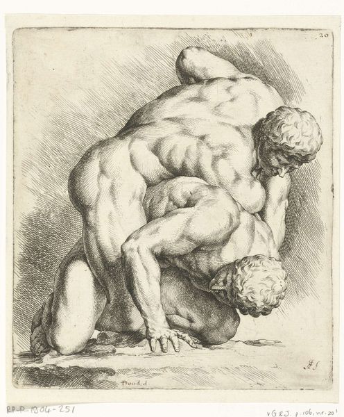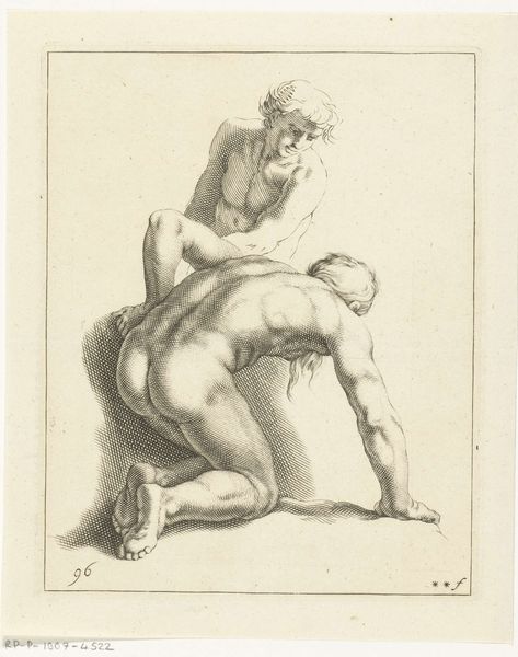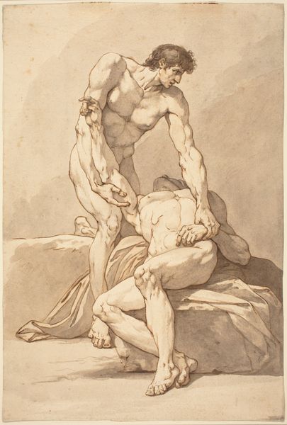Curator: This drawing, held here at the Rijksmuseum, is entitled "Studie van twee naakte mannen," or Study of Two Nude Men, attributed to François Boucher, and likely dating from 1713 to 1770. Editor: The tonality of this work is immediately striking, isn’t it? A sort of sanguine softness amidst the raw anatomical study, a somewhat detached view. Curator: Indeed. Note the clear, concise lines and precise shading—hallmarks of Boucher's Rococo aesthetic blended with academic draughtsmanship. The composition, however, reveals a study in contrasting forms. The standing figure dominates the composition from above. The one sitting assumes a submissive posture, which makes an interesting symbolic dynamic. Editor: I am drawn to the choice of medium here; dry media upon toned paper—we see the artist wrestling with immediacy, with capturing form almost impulsively. It speaks volumes of studio practices. Was this study intended for a larger work or valued in itself as material culture? That’s always on my mind. The labor inherent in creating these lines intrigues me as much as the final representation. Curator: Perhaps it's both. We know the Ancients had significant impact on the master, the emphasis on figuration and mastery of human form reflecting a debt to classical ideals that permeate Rococo. One must note, however, that such mastery over line and shadow can often become its own end. Editor: Precisely! How was it distributed? Who consumed these images of masculinity, and how did their interpretation hinge on the class and gendered views of the consumers? And the material conditions—were high-quality materials used, signifying artistic importance, or were these humble preparatory sketches on inexpensive supports? Curator: While the drawing evokes complex cultural interpretations that would have dictated consumption during its making, to be caught up in such analysis obscures how powerfully such works address core questions surrounding beauty, ideal form, and aesthetic experience. Editor: Perhaps. But I think the social, economic, and even the ecological footprint left by artwork cannot be disentangled from how beauty is seen—the materials, workshop, labor…it shapes beauty more than some realize. Curator: Well, our analyses reflect, as much as challenge, the work's enduring impact.