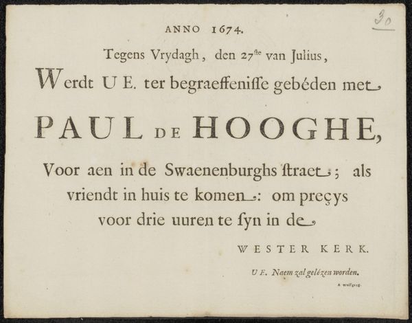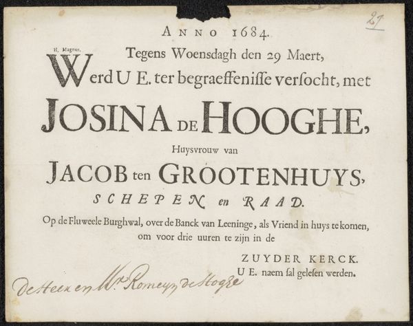Editor: So, this is an invitation to Isaac van Erpecum for the funeral of Nicasius de Hooghe, before 1661, made with print and typography, and also uses calligraphy. It has an antique feel; it makes me feel as if I'm there in that historical time. What meaning do you find within the text and the artistry? Curator: Well, it's fascinating how something as utilitarian as an invitation can reveal so much. Look at the font choices and the layout – it speaks to the social hierarchies and the perceived importance of the deceased and the recipient. The calligraphy, particularly the signature, adds a personal, almost intimate touch, amidst the formality of the printed text. Editor: You mentioned social hierarchies. How would the imagery communicate that? I just see a printed page with text, but maybe there's more than meets the eye. Curator: Consider the weight of those names, "de Hooge," repeated and prominently displayed. Names held immense power, linking families to land, status, and lineage. And then the fact that this was printed, rather than handwritten for everyone, signals a certain level of importance afforded to those invited. Do you think that such use of the names of people serves as symbol of an ancient version of an influencer's club, which signals exclusivity? Editor: That makes a lot of sense, I had not considered the deeper connection behind printing. Thanks for clarifying that for me, I have learned how the selection of fonts and arrangement contribute significance beyond its obvious message. Curator: Indeed. The seemingly simple invitation encapsulates social, cultural, and even economic information encoded within its design, preserving memories and values across generations.