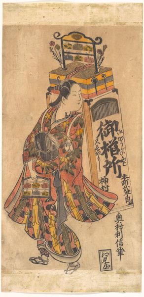 Editor: So, this is Nishimura Shigenaga's woodblock print, "The Actor Arashi Wakano," dating roughly from 1728 to 1748. The colors are quite striking, and the figure almost seems to float. What strikes you when you look at this, what layers are visible? Curator: Immediately, I see a deliberate construction of identity through layered symbols. The actor, the umbrella, even the plum blossoms – each speaks to specific cultural values and desires. Do you notice how the kimono itself acts as a narrative tapestry, adorned with miniature scenes? Editor: Yes, those tiny figures! They look like other actors, perhaps? Curator: Possibly. They reflect the actor's public persona, echoing stories and roles that resonate with the audience. Think of the umbrella: more than just protection from the elements, it signifies status, taste, and even a veiled sensuality in its delicate form. It reminds me of certain Buddhist protectors holding a parasol. What kind of emotion is elicited? Editor: A sort of controlled power, maybe? There's definitely a sense of performance, even off stage. It's also a peek into daily life. Curator: Exactly! Ukiyo-e prints like these served as cultural mirrors. The choice of plum blossoms, symbols of resilience and renewal, layered over the persona of Wakano allows us to understand more about the values held up in society. Each element allows us to understand the continuity of art within historical memory. What can we infer when understanding art is like this? Editor: It all comes together to paint a portrait, not just of a man, but of an entire cultural landscape! Curator: Precisely! This woodblock becomes a potent mnemonic device that continues to reveal layers of meaning over time.