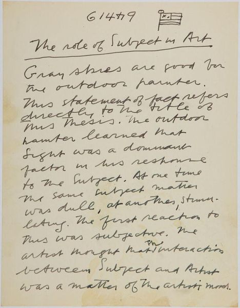 Editor: Here we have Stuart Davis's "Art Theory Text with Sketches," created sometime before his death in 1964. It looks like his written thoughts, paired with a geometric sketch. What do you see in this piece? Curator: I see Davis grappling with the essence of art, dismissing traditional notions of subject matter. The text hints at a desire to liberate art from the constraints of representation, mirrored perhaps in the abstract sketch. Does this resonate with a larger cultural movement of his time? Editor: Absolutely! He was working during a period of intense artistic experimentation. So, is he suggesting abstraction is the new symbolic language? Curator: Precisely. He's imbuing abstraction with its own set of symbols and meanings. It's a fascinating glimpse into his artistic mind. Editor: It's amazing how much is communicated through both the writing and the sketch. Curator: Indeed, the interplay between the textual and visual provides a deeper understanding.