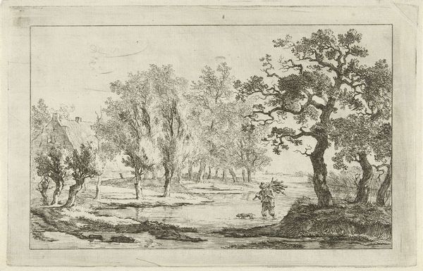 Editor: This is "Cow Pastured on Bank of River" by Martin von Molitor. It looks like an etching and the line work is incredible. I'm curious, what stands out to you about this piece? Curator: I'm immediately drawn to the labor involved in producing this etching. Think of the repetitive, physical process of creating those lines. The material reality of the copper plate and the artist's hand become central. Editor: So you're seeing the work as a product of its making. Curator: Precisely. And what of the pastoral scene itself? It idealizes rural labor, while the artwork embodies it. A tension exists between representation and material reality, wouldn't you say? Editor: That's a cool connection I hadn't considered. Thanks for pointing that out.