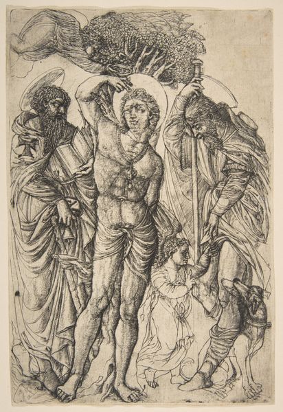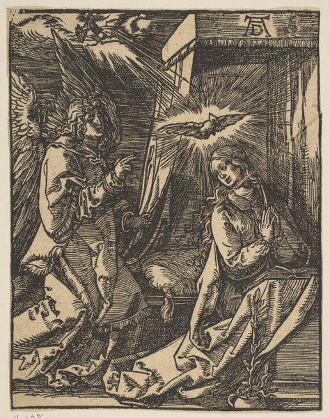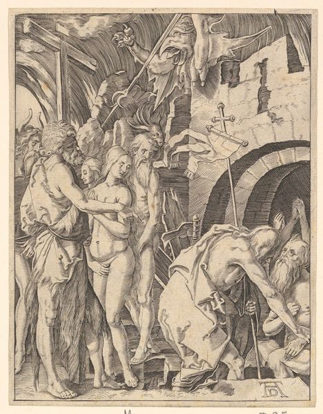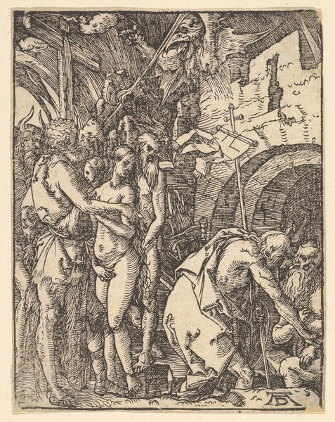 Editor: This engraving, titled "Engraved copies of The Little Passion," attributed to Albrecht Dürer and dating from between 1485 and 1699, depicts Adam and Eve being expelled from the Garden of Eden. The detail is striking. What's your take on this work? Curator: This engraving is not just a depiction of a biblical story, it’s a visual articulation of power, gender, and transgression, speaking directly to the patriarchal structures that have shaped Western art and thought for centuries. Editor: Can you elaborate on that? Curator: Consider the angel looming over Adam and Eve, brandishing a sword. Who authorized this power? From whose perspective is this “justice” being meted out? The narrative places blame squarely on Eve, reinforcing the problematic idea of women as the primary instigators of wrongdoing and suffering. And note how the depiction of their bodies—especially Eve's—serves to simultaneously punish and eroticize her. It caters to the male gaze even as it condemns her actions. Editor: That's a very interesting point of view, different from the way I initially looked at it. Curator: It also intersects with broader social power dynamics; the ruling class during the Northern Renaissance, very much like now, uses cultural narratives like this to establish power over those without it. What if, rather than accepting this narrative, we reclaim the symbol of the apple to be representative of Eve's thirst for knowledge and the desire for free will? What meanings could be born out of that narrative subversion? Editor: So, this artwork really offers a window into the prevailing gender politics of the time, but with the added lens of critical theory, it offers valuable insight into present-day concerns, as well. Curator: Exactly. Examining Dürer's choices reveals how art can both reflect and perpetuate inequalities, and inspires viewers to re-evaluate power systems of all times.