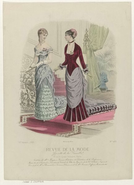 Editor: So, this watercolor print is called "Revue de la Mode, Gazette de la Famille," published January 24, 1884, credited to A. Chaillot. The women's dresses are incredibly detailed. What strikes you about it? Curator: The material representation is fascinating. Look at the juxtaposition: stiff corsetry contrasted with flowing fabrics. This image isn't just about aesthetics, it's about production. Who made these garments? How were these patterns developed and distributed? The journal itself is part of a system of consumerism, driving the desires that demand this labor. Editor: I hadn’t thought about that. I was just admiring the details like the ruffles and the train. Curator: Consider the watercolor technique, too. It mimics the ephemeral, delicate quality desired in the clothing. Watercolor lends itself to reproduction through printmaking; allowing widespread access to these images that dictated societal norms. It is designed to fuel this demand. How do these material conditions shape our understanding of “fashion”? Editor: So you’re saying the image itself is a commodity, part of the engine of fashion? It makes you wonder how different life was for those producing these garments. Curator: Exactly. And this journal places itself as a 'Gazette de la Famille'- a seemingly harmless source, while acting as a propagator of a burgeoning capitalist fashion industry built on complex modes of labor. Editor: I will never look at a fashion plate the same way again! Curator: Precisely. We’ve gone beyond simple appreciation of aesthetics to recognize the intertwined socio-economic system that it supported.
