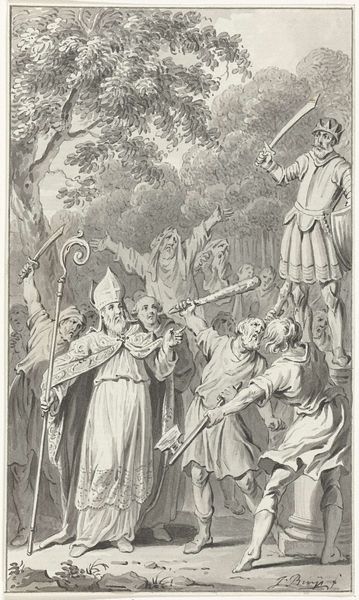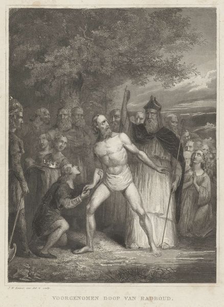 Johann Wilhelm Kaiser created this print, "Willibrord preaching on Walcheren, 695", in the nineteenth century. The print depicts Saint Willibrord, an Anglo-Saxon missionary, introducing Christianity to the region of Walcheren, now part of the Netherlands. Kaiser made this print during a period of national romanticism in the Netherlands. These artistic and intellectual movements often emphasized the importance of national history and identity, seeking to define and celebrate what it meant to be Dutch. It’s worth noting that the act of converting to Christianity had far-reaching implications for the local population, impacting their cultural traditions, social structures, and belief systems. The act of one culture imposing its beliefs on another, especially through religious conversion, carries significant historical and ethical weight. The story of Willibrord preaching becomes not just a tale of religious conversion, but also a reflection on power dynamics. Consider the emotional and cultural impact on those who were asked to abandon their ancestral beliefs for a new faith.