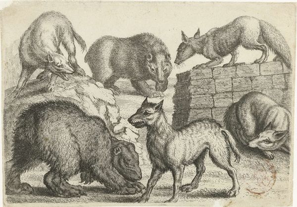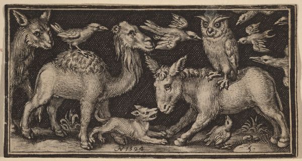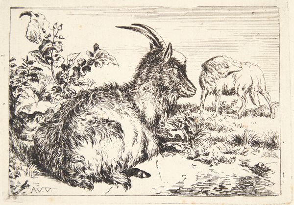 This engraving, "Goat and Buck with Young" was made by Nicolaes de Bruyn, a Dutch artist active in the late 16th and early 17th centuries. In this small but evocative piece, de Bruyn captures a pastoral scene, typical of the period, but it is teeming with subtle commentary. The bucks and goats, rendered with meticulous detail, invite reflections on themes of domesticity and nature. The inclusion of the young goat nursing adds layers of emotional resonance, evoking ideas of maternal care, vulnerability, and the cyclical nature of life. The work perhaps speaks to the socio-political landscape of the time, providing a delicate counterpoint to the pervasive themes of power and conquest. The choice of animals, seemingly innocuous, raises questions about the representation of the rural population and the inherent biases in artistic expression. This print encourages us to look beyond the surface, considering the untold stories and suppressed voices that are often obscured within the canon of art history.