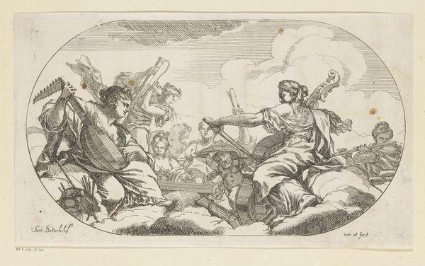 Editor: This is "Cardinal Virtues," a 1717 engraving by Bernard Picart, here at the Rijksmuseum. It feels like I'm looking at a gathering of classical goddesses floating on clouds. The figures and objects seem symbolic... but what do they signify? What can you tell me about it? Curator: This image presents a visual codex of moral and ethical ideals. It is fascinating how Picart distills these concepts into symbolic figures. See the figure holding a mirror? That's Prudence, the ability to discern appropriate actions. Mirrors traditionally symbolize self-knowledge. Editor: So, looking into the mirror represents knowing yourself, your motivations? Curator: Precisely. And next to her, that is Fortitude, armed with a club, representing strength of character to overcome obstacles. Doesn't it remind you of Hercules? The way visual memory allows for narratives to persist across time? Editor: Absolutely. The club really roots her in that classical heroism. What about the figure holding the scales? Curator: That's Justice, naturally, essential for societal harmony. But notice how the cherub peers at her... are they impartial arbiters of right and wrong or… Editor: Perhaps more of a warning, reminding us that justice is always being watched and should not be corrupted. And the fourth figure with the bowl? Curator: Temperance, encouraging moderation and self-control in all things. These virtues, carefully composed, formed a crucial moral framework in the 18th century. These aren’t just figures; they're invocations, reminders. What emotional impact does the engraving have on you now that you know more? Editor: Knowing the symbolism gives the image a lot more gravity. It's no longer just a pretty scene; it's a lesson, a reminder of how to live. Curator: And that’s how images embed values in the viewer’s mind through enduring visual language!