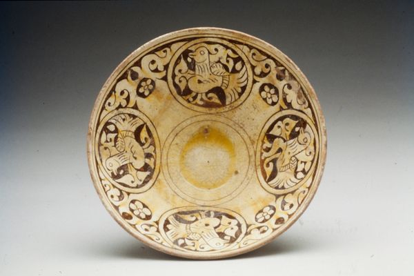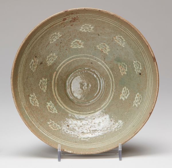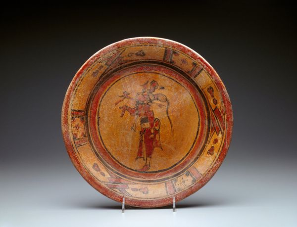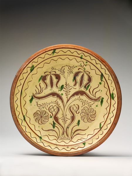 Editor: Here we have a striking earthenware plate dating from around 1790-1800, attributed to John Leidy I and currently residing at The Met. There's a folk-arty simplicity to the botanical design, almost like a child's drawing. What strikes you most about this piece? Curator: Immediately, I'm drawn to the materiality of this plate. The earthenware speaks to its function, likely for everyday use, perhaps among the burgeoning middle class of the late 18th century. Consider the labor involved: the extraction of the clay, the forming, firing, and the hand-painted decoration. What does the simplicity of the design suggest about the skills or training available to the maker, and perhaps the intended market for this object? Editor: That’s a perspective I hadn't considered. It made me appreciate it more, instead of seeing just a rustic floral design. I now consider more carefully its context and place in the economic landscape. Curator: Exactly! And think about the glaze – that muted yellow isn’t just decorative. The production and application of glaze were vital processes. Were there local sources for these materials? Was this made using local production? The plate whispers of specific techniques and specific conditions of artisanal labor in a certain era. Editor: It's interesting to view a simple plate not just as a decorative item, but as a document of material history. Thank you! Curator: Precisely. Seeing art as material culture redefines what we value.