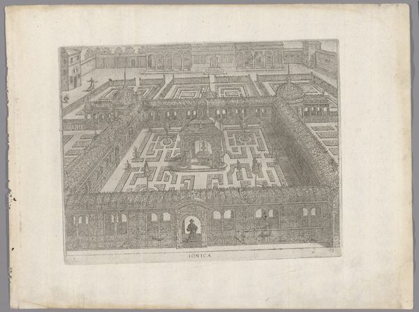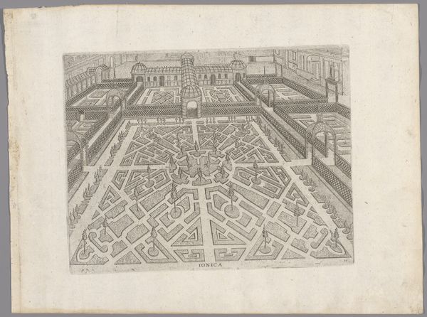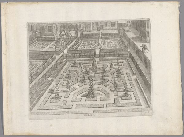 Editor: This print, "Tuin met centrale parterre en diagonale paden," dating from 1583 to 1640, is attributed to an anonymous artist. It's rendered in ink on paper using the engraving technique. I’m struck by the geometric intensity of this garden layout, it almost feels like a maze imprinted on paper. How do you interpret this work? Curator: What stands out to me is the overt symbolism and meticulous structure within the garden. A garden is never *just* a garden. The organization-- those crossing diagonal paths—they speak of a specific kind of control and order, not just over nature but over society too. How might these paths reflect the societal structures of the time? Editor: Well, I suppose the rigid paths and clipped hedges suggest a desire for control, perhaps mirroring the hierarchical structure of the nobility? Curator: Precisely. And observe the central parterre. The very word "parterre" carries significance. Do you recognize any potential underlying symbolic meaning in its construction? Editor: Maybe it signifies some form of the classical tradition being literally cultivated during the renaissance, re-establishing idealized nature in daily life? Curator: I’m intrigued by the level of idealization that would attempt to map classical forms onto landscapes during a period of burgeoning intellectual inquiry. But let's also acknowledge how the artist translates spatial depth on paper. What elements do you consider suggestive when assessing perspective? Editor: Now that you mention it, I notice the orthogonal lines converge to an implicit vanishing point to mimic three dimensions... But that reminds me, these gardens seem incredibly labor-intensive! What does maintaining them reveal about available resources? Curator: Absolutely, this reflects the resources and power of the elite. Remember, visual culture reveals unspoken truths about a society's priorities. Thank you for lending your perspective. I, too, have noticed how this print distills larger socio-economic realities onto paper.