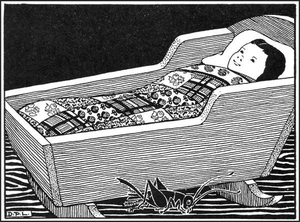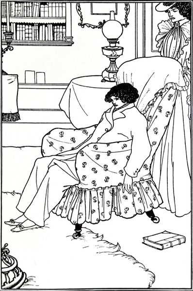 Editor: Here we have Dorothy Lathrop's illustration "HITTY by Rachel Field 12", created in 1929 with pencil on paper. The contrast between the doll and the striking patterned wallpaper is quite arresting. What are your thoughts on this work? Curator: Well, seeing as this illustration depicts a manufactured doll, "Hitty," it begs us to look into the labor behind such a creation. How was this doll constructed? What materials were used, and who profited from her production and distribution? We have to consider this not as a simple rendering, but the culmination of resources. Editor: So you are less interested in what is literally depicted and more about how the depicted objects came to be. Can you explain a bit more? Curator: Precisely! This isn’t just about figuration, but about material culture. The pencil itself is important – graphite mined, processed, encased in wood, each step with its own human and environmental impact. Lathrop made a deliberate choice to capture "Hitty" and its accessories through readily available materials. Why? It could be considered subversive act, bridging fine art and commonplace commodity. Editor: That’s a fascinating point about the humble medium echoing themes of accessibility and questioning artistic value! What about the act of illustration for children? Curator: Yes, thinking about the artwork in relationship with publishing for children puts its distribution and audience squarely within a system of cultural and economic exchange. Who gets to see this work and what values does it impart? Lathrop isn't simply providing visual accompaniment but actively engaging in a conversation about consumerism and artistic merit. Editor: I had not considered it that way! Looking at the labor of illustration opens up a new viewpoint on it. Curator: It shifts the focus from mere representation to understanding how making shapes not just art but also culture, for adults and children alike!