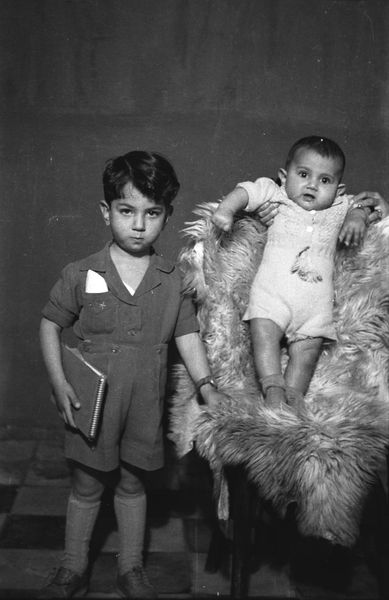 Editor: This photograph, "Palestinian resistants," by Akram Zaatari, comes from a series taken between 1968 and 1972. The subjects are serious and self-possessed. What do you see in this piece? Curator: I see the potent symbolism of youth intertwined with conflict. The child, flanked by armed men, represents both vulnerability and the future. Consider how the image echoes historical depictions of innocence lost to war. Editor: It's chilling to think of a child positioned within this narrative. Does the photograph invite a particular emotional response, or is it meant to document a reality? Curator: It evokes a complex blend of emotions, doesn't it? The photograph freezes a moment, prompting us to consider the weight of inherited struggle. What lasting impression does it leave on you? Editor: The weight of expectation, I think. Thank you.