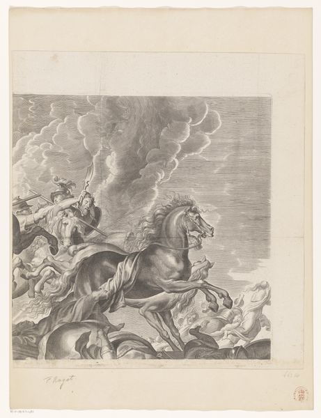 Curator: What strikes me first about this engraving, "Gevecht tussen Amazones en Grieken (deel midden boven)" or "Battle of Amazons and Greeks" as we'd say in English, made sometime between 1648 and 1670, is its sheer intensity. A cacophony of bodies clashing on horseback above a bridge. Editor: Indeed, there's a palpable sense of violence, a struggle frozen in time, and its making me think about what kind of narrative is at play here, and what power dynamics it represents. A fight between Amazons and Greeks... who is telling this story? Curator: Exactly! Well, the artist, François Ragot, really captures this chaotic scene in that high baroque style. See how the figures spiral upwards, their limbs and drapery flowing with dramatic energy. It’s visually overwhelming, almost theatrical. Editor: It's interesting how theatrical it is. And theatricality is also artifice. Baroque art can do that—perpetuating established notions of power, presenting a heroic narrative but from whose perspective? And is it not relevant to reflect about how the "Battle of Amazons" becomes this sort of symbolic conflict, setting up binary oppositions...like men vs women, or civilized versus the "other"? Curator: Ooh, good point. The engraving does seem to glorify the battle without questioning its implications. Maybe this romanticised depiction normalizes these historical conflicts, casting them as grand spectacles of courage. The Greeks versus the Amazons wasn't just a battle but a clash of civilizations, each with their own ideologies. What side do we naturally want to root for and why? Editor: This also reminds me how "Amazons" themselves were historicized through a Western-male gaze. How might an Indigenous studies framework offer alternative perspectives on how this encounter might unfold and play out? It feels like so much more than just a depiction of war and the medium itself, a print, intended to circulate ideas to a wide audience...It speaks to larger issues around history, representation, and cultural identity, so perhaps not as innocuous as it appears at first glance? Curator: Agreed. I walked in here seeing "drama, artifice and grandiosity", and now it's taken on much more weight... food for thought about whose story is being told. It shows that artworks really become meaningful when we question them! Editor: Yes! To be alive and critical, inviting further conversations—to deconstruct our ways of viewing art and our biases, but that's exactly where transformation starts...