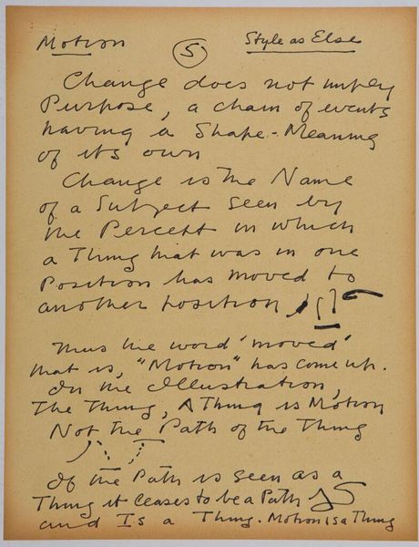Editor: So, this is Stuart Davis's "Art Theory Text with Scribble." I find it really intriguing... it's just his handwritten notes, but it feels like a window into his artistic process. What strikes you about this piece? Curator: It's pure Davis, isn't it? The way he jumbles words and scribbles... it's like a visual jazz riff. He's wrestling with ideas of representation, what is a thing, and if it has any meaning, very meta, don't you think? Editor: Definitely! It almost feels like he's trying to break down language itself. I never thought I would find handwriting so stimulating. Curator: He's trying to find the essence of things. The language is there, so he can think about it differently and represent the world in his own unique way. Editor: That makes so much sense! I see it completely differently now.